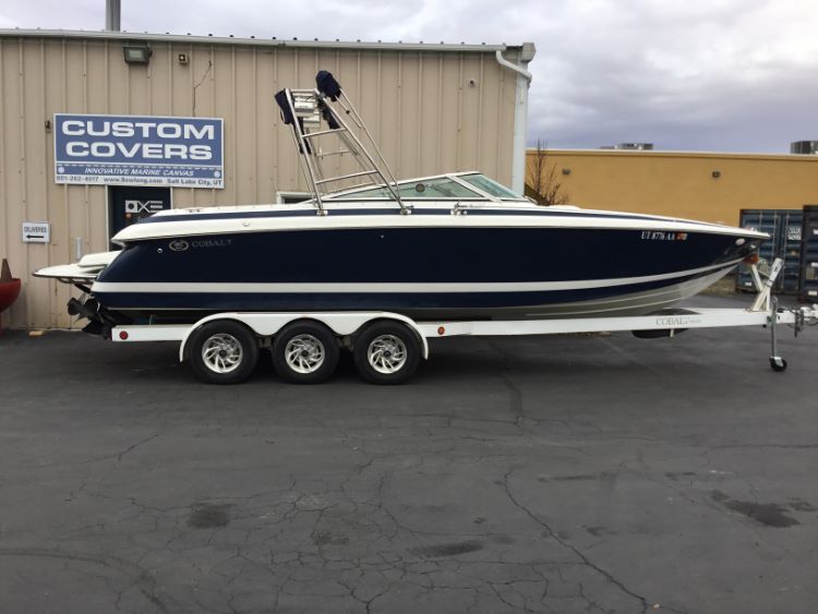 Custom Fabrication: Our standard cover is made to be used on a trailer, with tie-offs on the back of the boat. For customers wanting to use this cover on a boat lift, we can configuring it with the main tie-offs on the side.