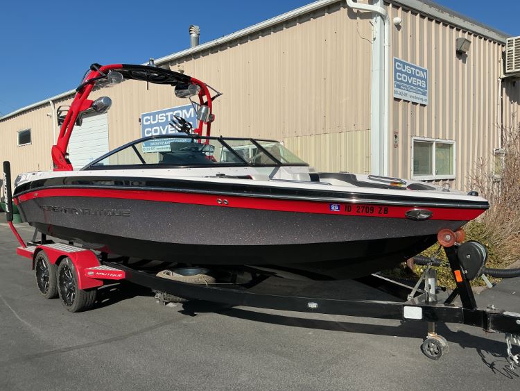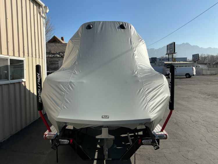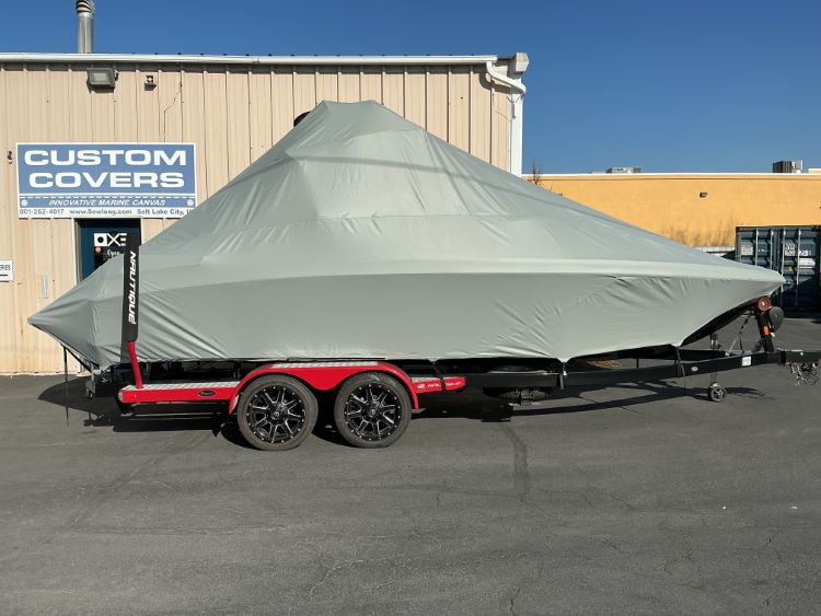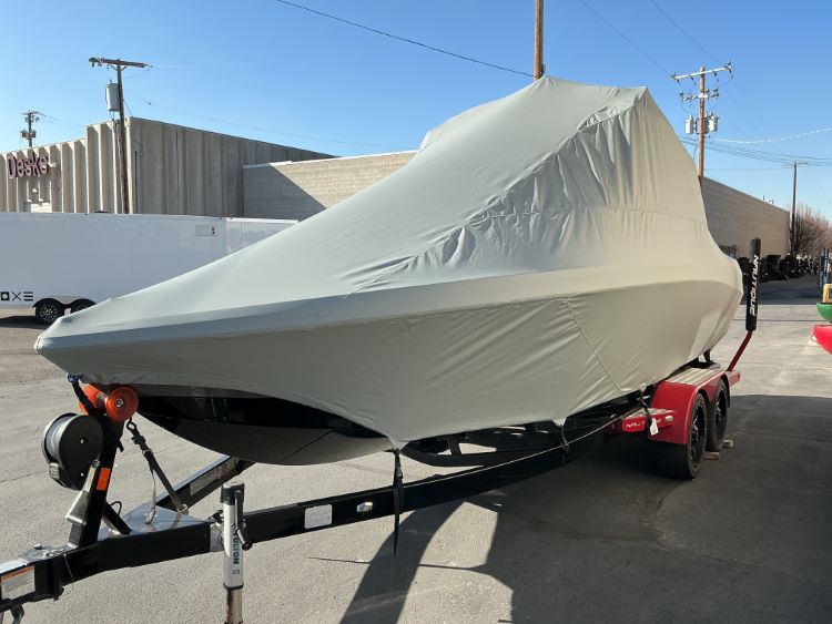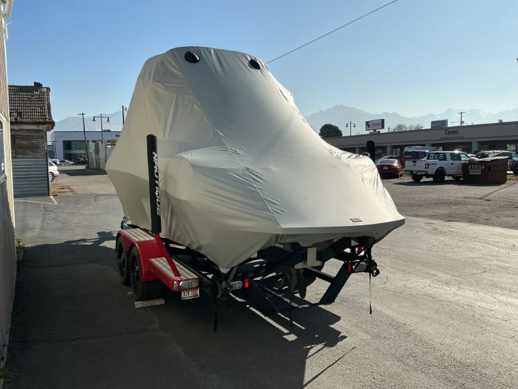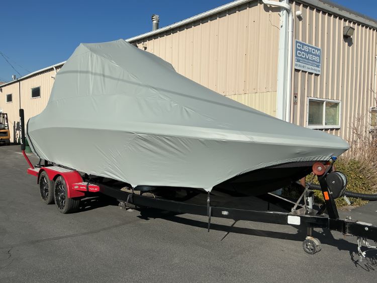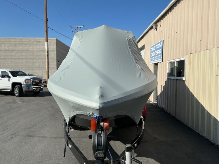Custom Fabrication: Our standard cover is made to be used on a trailer, with tie-offs on the back of the boat. For customers wanting to use this cover on a boat lift, we can configuring it with the main tie-offs on the side.